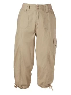 Sportive Capri-Hose mit geripptem Dehnbund, Gürtelschlaufen sowie Knopf- und Reißverschluss. 2 aufgesetzte Taschen vorne, 1 Pattentasche auf dem linken Hosenbein und 2 hinten, jeweils mit 1 Knopf. Beinabschluss mit Durchzugband zur Weitenregulierung. Fußweite ca. 45 cm. 98% Baumwolle, 2% Elasthan. Maschinenwäsche.
