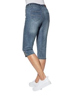 Capri-Jeans im bayerischen Lederhosen-Style. Im typischen Trachten-Look mit aufwändig besticktem Latz und Knöpfen in Hornoptik. Formbund mit Gürtelschlaufen sowie Knopfverschluss vorne. 2 Taschen vorne. Passformsattel hinten, 2 Gesäßtaschen. Beinabschlüsse mit kleinen Schlitzen, Stickerei und Knöpfen in Hornoptik. Leichte Used-Effekte. Fußweite ca. 41 cm. 78% Baumwolle, 20% Polyester, 2% Elasthan. Maschinenwäsche.