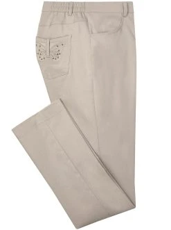 Super elastisch, super bequem, super gepflegt: Die Hose in Bengalin-Qualität ist ein Multitalent! Mit seitlichem Dehnbund, Gürtelschlaufen sowie Knopf- und Reißverschluss. 2 Taschen vorne und 2 Gesäßtaschen mit süßer Schmetterlings-Stickerei und Nietenverzierung. Fußweite ca. 38 cm. 72% Viskose, 25% Polyamid, 3% Elasthan. Maschinenwäsche. Ohne Gürtel.