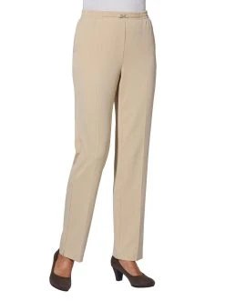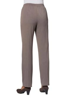 Bequem und sehr gepflegt! Die Doppelpack Hosen begeistern durch den komfortablen Rundum-Dehnbund mit glatter Partie vorne, die mit einem dekorativen Riegel mit Zierspange geschmückt ist. 2 seitliche Taschen. Die Bügelfalten wirken vorteilhaft streckend. Kurze Schlitze am Beinabschluss. Fußweite ca. 42 cm. Ohne Gürtel. 75% Polyester, 20% Viskose, 5% Elasthan. Maschinenwäsche.