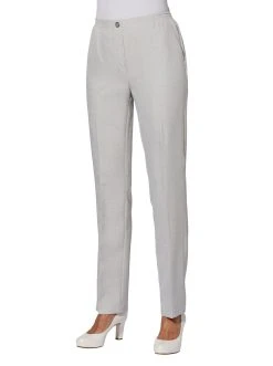 Sehr gepflegt! Hose in komfortabler Schlupfform und Leinen-Optik mit Reißverschluss-Blende vorne. Streckend durch die Bügelfalten. Der Rundum-Dehnbund mit glatter Partie und Zierknopf vorne sorgt für viel Bequemlichkeit. Seitenschlitze am Beinabschluss. 2 seitliche Taschen. Fußweite ca. 42 cm. 100% Polyester. Maschinenwäsche.