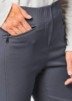 Stretchhose LOUISA trägt sich rundum angenehm dank des elastischen Materials mit angerauter Innenseite. Schmaler Schnitt mit bequemem Schlupfbund und Längsteilungsnähten im Vorder- und Rückteil für eine schlanke Silhouette und flache Bauchpartie. Mit optischem Reißverschluss und Taschen mit Reißverschlüssen. Saumweite ca. 34 cm. Schmale Beinweite.