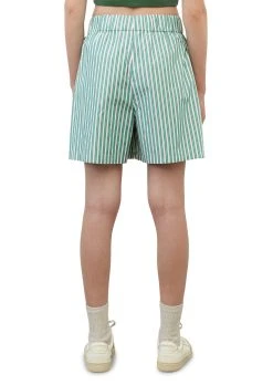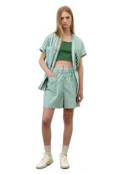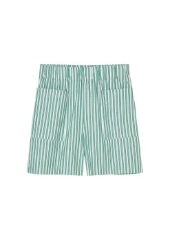 Der angesagte Pyjama-Stil mit klassischen Streifen begegnet uns hier auf einer Shorts mit weitem Bein und femininem High-Waist-Bund. Die kurze Hose ist aus Bio-Baumwolle in glatter Popeline-Qualität gefertigt und hat durch die Längsstreifen einen streckenden Effekt. Der elastische Bund liegt locker auf der Taille und auf der Front wird eine aufgesetzte Tasche zum Eyecatcher. Perfekt für Sommer, Strand und City!
