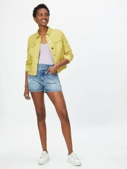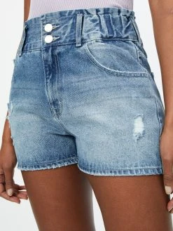 – Jeansshorts mit High Waist – Frontverschluss – Elastischer Taillenbund – Five-Pocket-Style – Destroyed-Details – Schritthöhe: 7,5 cm in Größe S – Das Model trägt Größe S