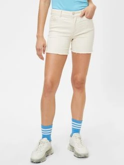 – Jeansshorts mit High Waist – Frontverschluss – Elastischer Taillenbund – Five-Pocket-Style – Destroyed-Details – Schritthöhe: 7,5 cm in Größe S – Das Model trägt Größe S