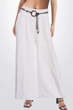 Eine luftig fallende Damen Leinenhose mit einem weiten Beinabschluss, die dich sofort in Urlaubsstimmung versetzt. Die Schlupfhose hat einem breiten Taillenbund für einen angenehmen Tragekomfort an warmen Tagen. Sie verfügt über Gürtelschlaufen und einen Bindegürtel aus Textilfasern und Kunstperlen. Das Gewebe in typischer Leinenstruktur ist angenehm und leicht auf der Haut. Die kühlenden Materialeigenschaften von Leinen sind perfekt für den Sommer. Kombiniert mit einer Bluse und sommerlichen Sandalen werden Sie zu einem echten Hingucker.