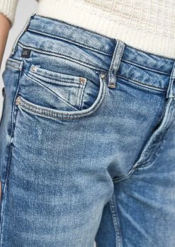 Denim. hat ein Straight Leg, hat einen mittelhohen Bund, im Slim Fit. hat ein Leder-Patch, hat einen Wascheffekt. Denim, Baumwollstretch, elastisch. mit Gürtelschlaufen. mit Knöpfen, mit verdecktem Reißverschluss, mit Taschen im 5-Pocket-Design.