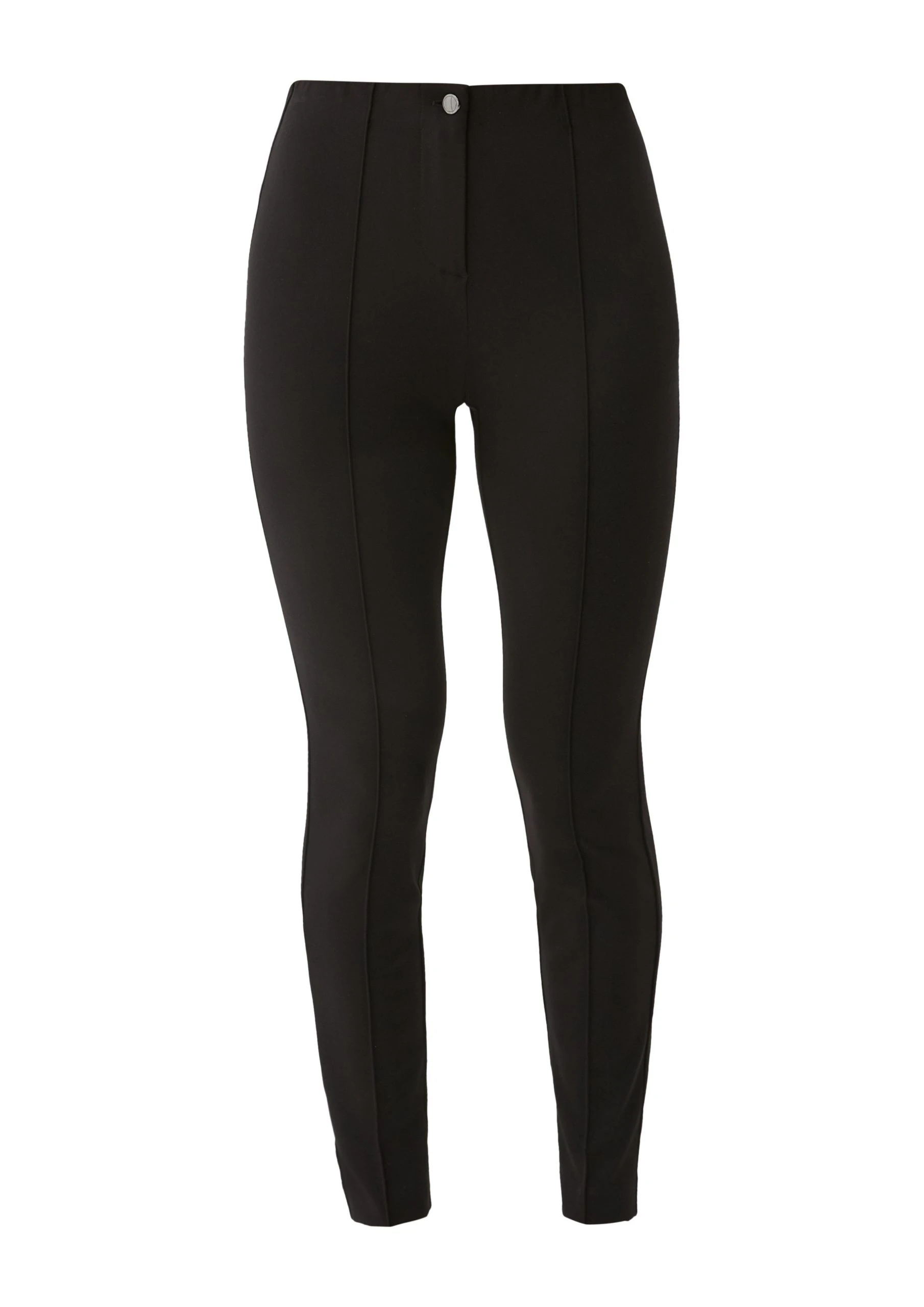 Leggings. hat einen mittelhohen Bund, hat ein Slim Leg. Ziernaht als besonderes Detail. in elastischer Qualität, fein, aus Webware. mit Elastikbund. hat einen Knopfverschluss, hat einen Reißverschluss.