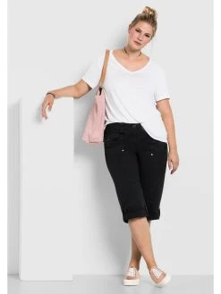 Stretch-Hose in 3/4-Länge von sheego mit modischen Teilungsnähten. Besonders praktisch ist die Krempelfunktion am Beinabschluss. So kann die Hose zur Bermuda gekürzt und per Riegel und Knopf fixiert werden.